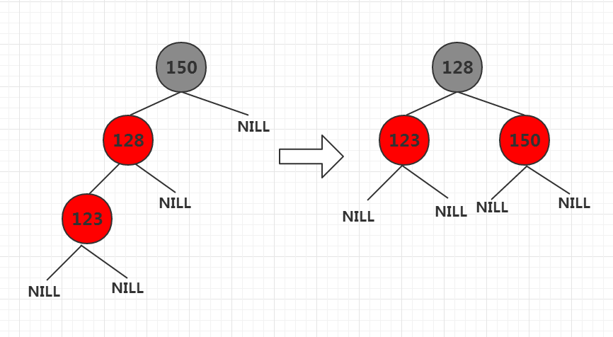 case 2.1 当前节点父节点是其祖父节点的右孩子,当前节点是其父节点的左孩子,那么以当前节点的父节点为 支点进行右旋,如下图: