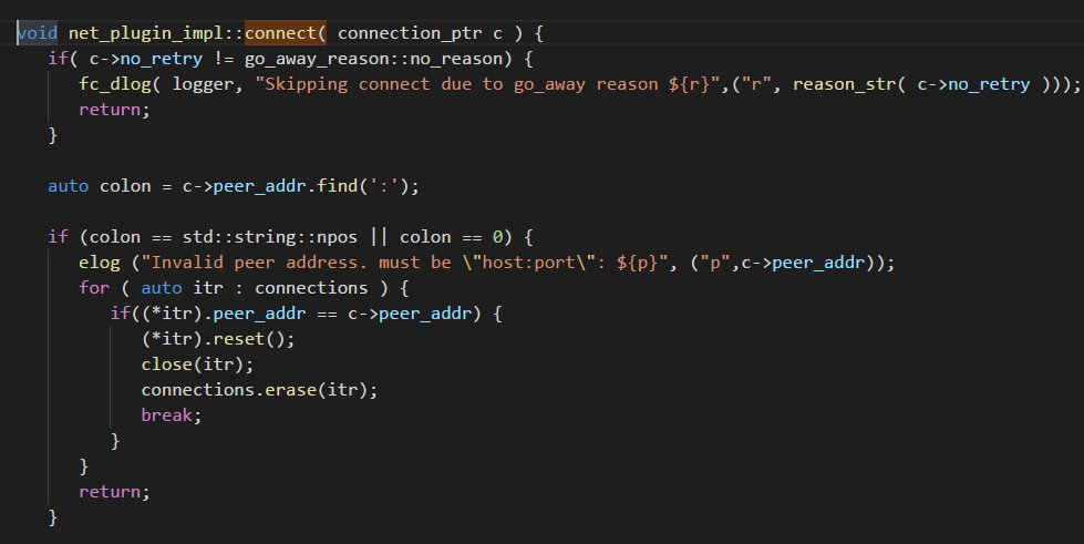 2 void net_plugin_impl::connect( connection_ptr c, tcp::resolver::iterator endpoint_itr ) 该函数将connection连接指定地址